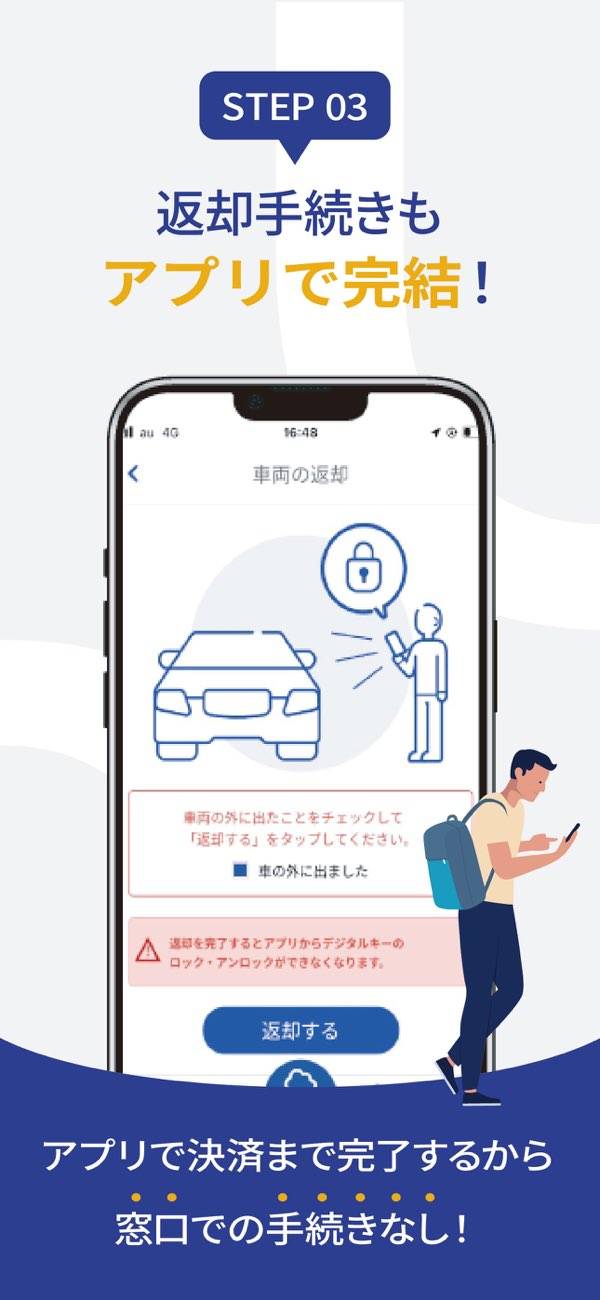返却は車を元の場所に戻し、アプリで手続きするだけ。人とのやり取りが無くスムーズですよ。