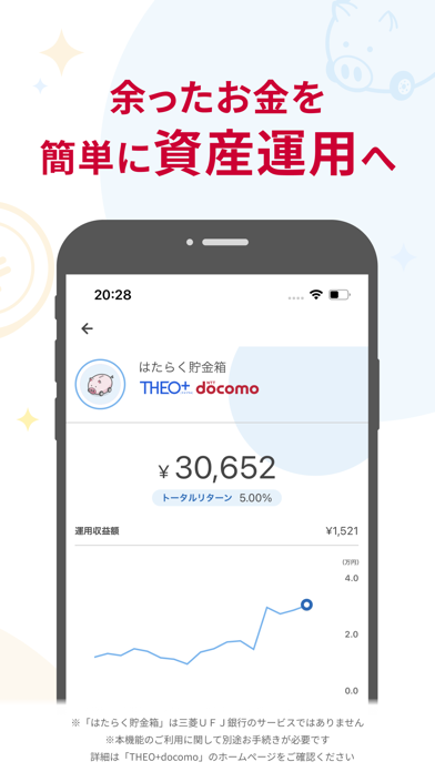 本格的な資産運用をしたい人は「はたらく貯金箱」がおすすめ。「THEO+ docomo」との契約などが必要ですが、プロやAIにすべておまかせできるので、初心者でも安心して資産運用に挑戦できます。