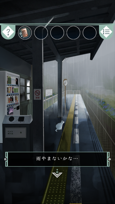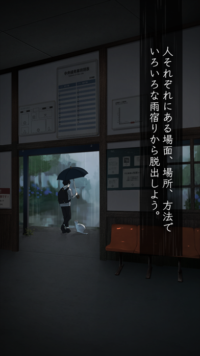 雨宿りする人々が、外へ出る方法を模索するステージ制の脱出ゲーム。小学校の昇降口や駅舎など、2ステージごとに舞台が切り替わり、同じ舞台でも主人公が変化。さらに、前のステージの主人公による行動が、次のステージの主人公の謎解きにつながります。また、雨が降るしっとりとした雰囲気や人々の温かさも感じられます。
