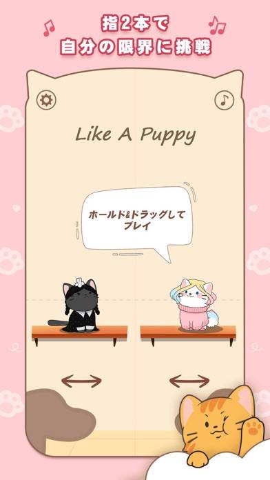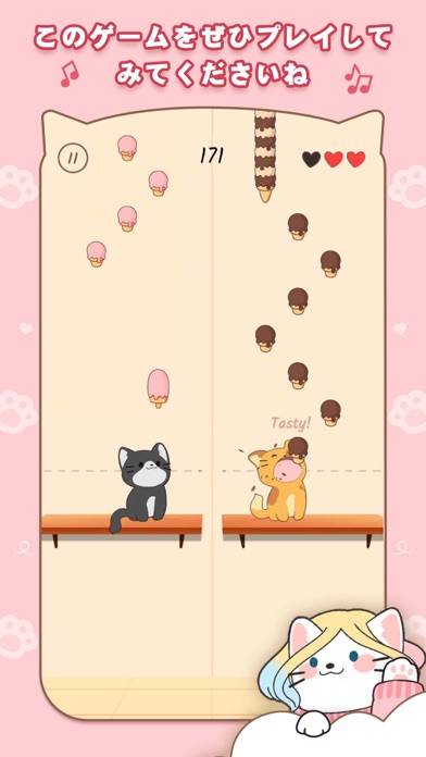 流れる音楽に合わせて、2匹のネコを同時にスワイプで操作。上から落ちてくるエサをネコに食べさせるように、左右に移動させます。ネコはエサを食べた瞬間に、音楽に乗せて「ミャー」とかわいらしく歌唱。エサを1個でも落とすとゲームオーバーです。