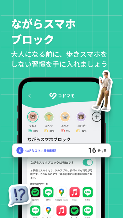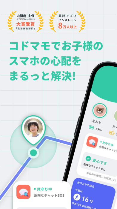 『コドマモ for Kids』と連携して、子供のスマホ利用を見守れるアプリです。歩きスマホの防止やSNSの危険チャット検知、使用時間の制限まで機能が充実。外出中の居場所確認もでき、忙しい毎日の中で手軽に子供の安全を守れます。