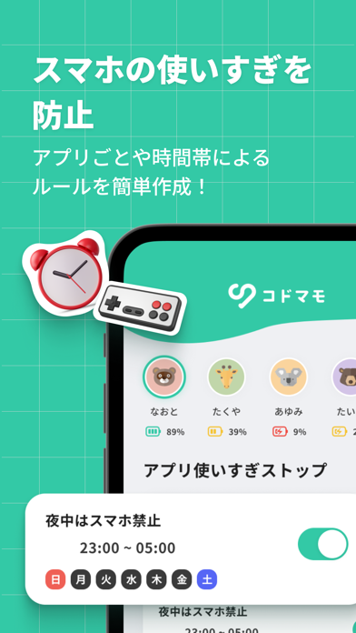 - アプリごとに利用時間を設定できるから、スマホの使いすぎを防げる