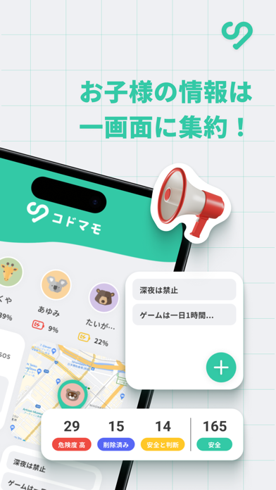 『コドマモ for Kids』と連携して、子供のスマホ利用を見守れるアプリです。歩きスマホの防止やSNSの危険チャット検知、使用時間の制限まで機能が充実。外出中の居場所確認もでき、忙しい毎日の中で手軽に子供の安全を守れます。