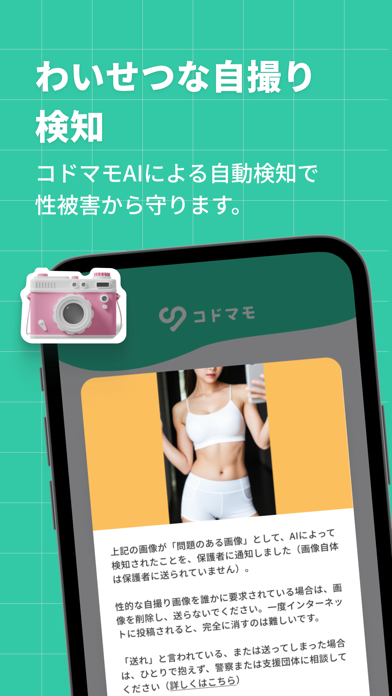 歩きながらのスマホ操作を防ぐ機能があり、移動中は自動でアプリの操作がブロックされます。さらに、SNSのやりとりに危ない表現があるとAIがチェックして通知。わいせつな画像の撮影も検知できるため、ネットいじめやトラブルを未然に防ぎやすくなります。