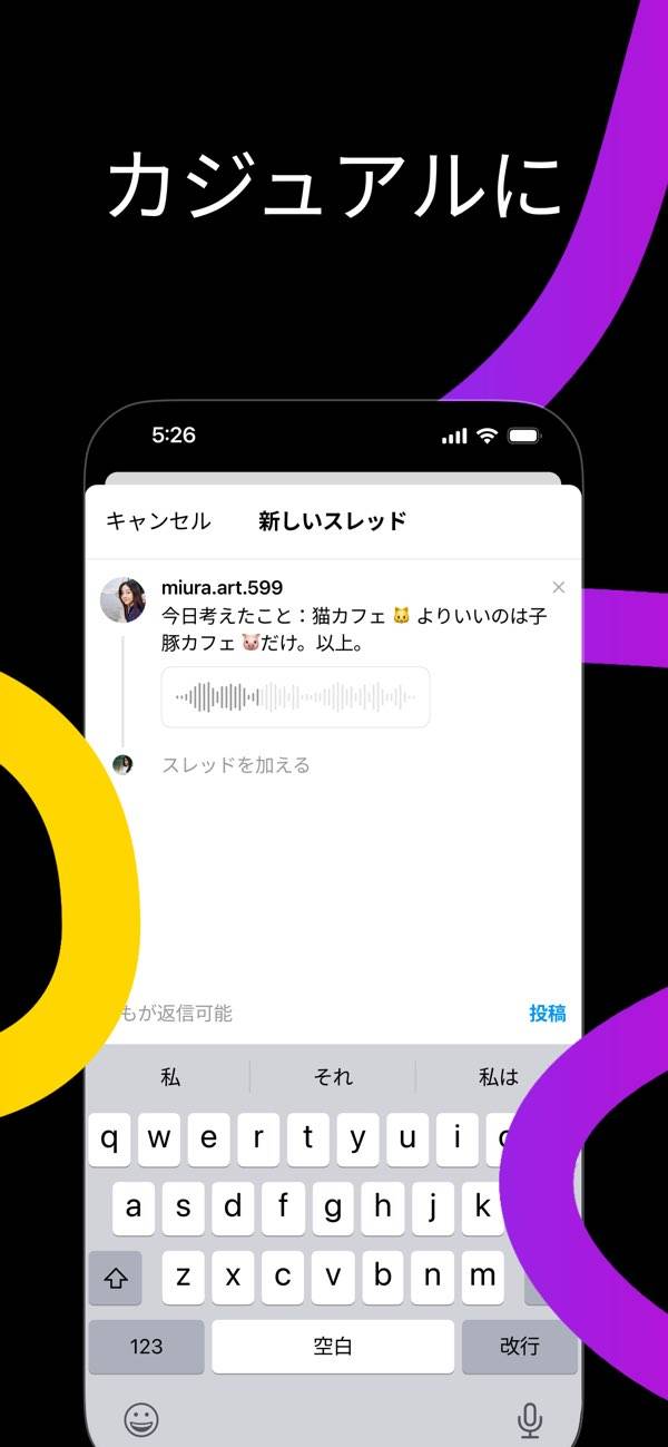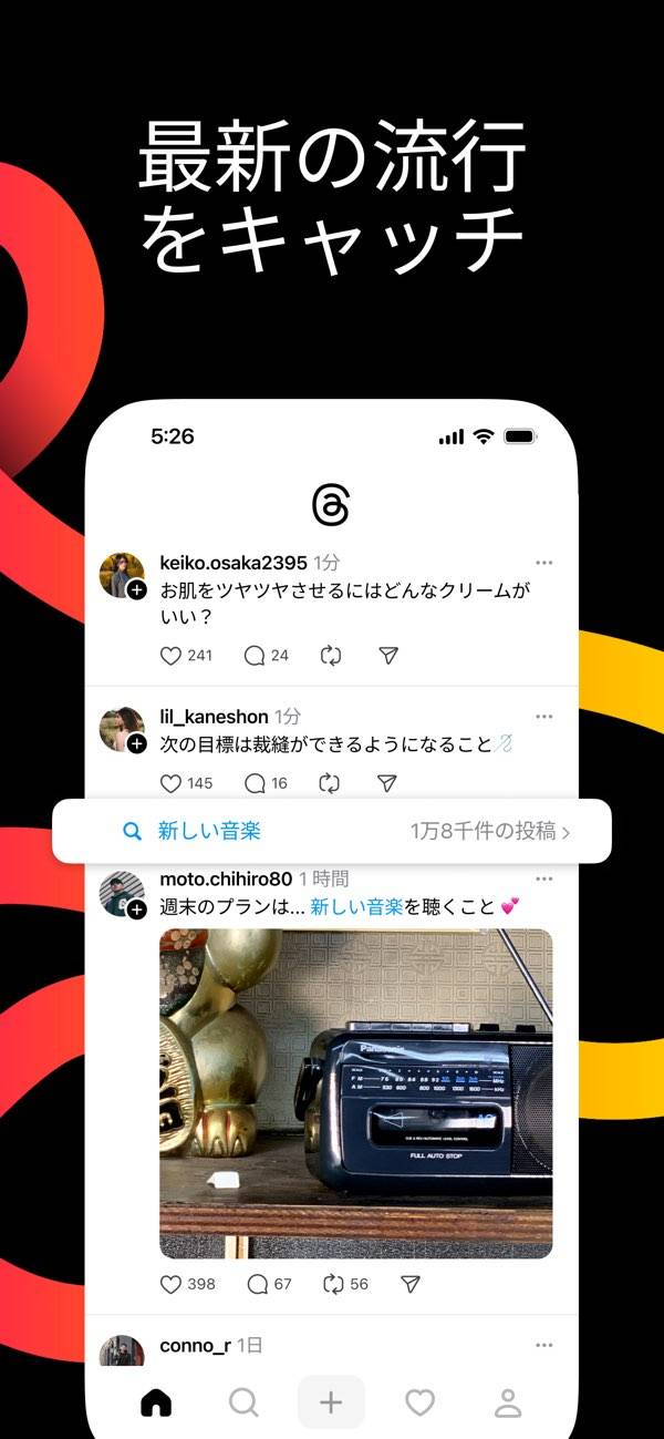 推しの投稿を追いたくて使い始めましたが、自分でもたまに投稿しています。写真なしで思ったことをサッと書けるのが楽で、タイムラインもそこまでギスギスしていないので、のんびり眺めるのにちょうどいいです。ほかのSNSだと、インプレゾンビとか、性的な広告とかが流れてきて疲れてしまうのですが、Threadsではそういった投稿が目に入らないので、つい毎日開いちゃうんですよね。