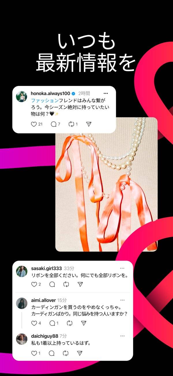Instagramアカウントと連携しておけば、インスタのプロフィール画面からすぐログインできるから楽ちん。フォロー中の人の投稿も探しやすくスムーズ。フィードごとにサクッと会話できて、新しいトレンドをキャッチするにはいい感じ。