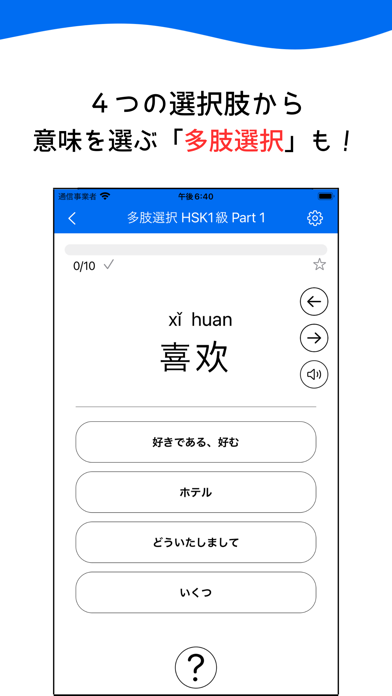 四択問題が出される「多肢選択」、読み上げ音声から中国キーボードで答えを入力する「听写」など、モードも充実していますよ。