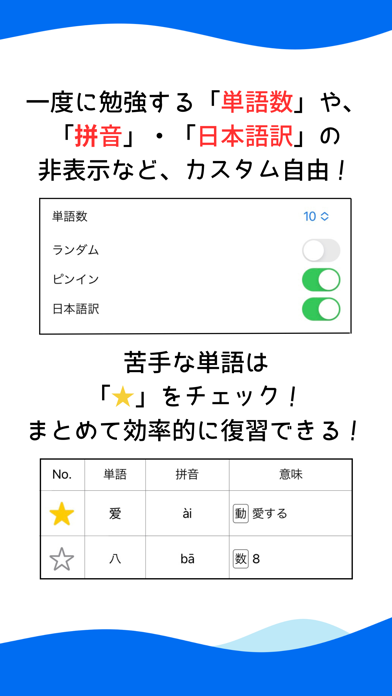 - 中国単語の意味や発音とともに、ピンインを覚えられるアプリ