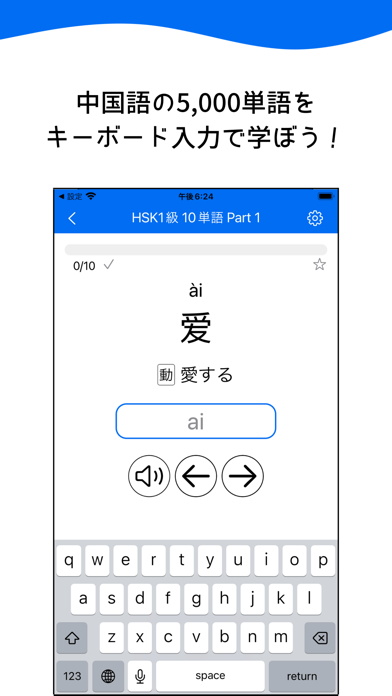 中国語のローマ字表記「拼音(ピンイン)」と、単語の意味を学習できるアプリ。当てはまるローマ字または漢字を入力して、クイズ形式に単語を学べます。