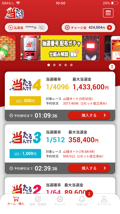 宝くじ感覚でオートレースに参加できるアプリ。抽選番号形式のくじを購入するため、オートレースに詳しくない人でも参加しやすいです。くじの購入から当選金の受取手続きまで、すべてスマホでできるため、場所や時間を問わずに利用可能。チャージ方法は、「PayPay」やクレジットカードなど幅広く対応しています。