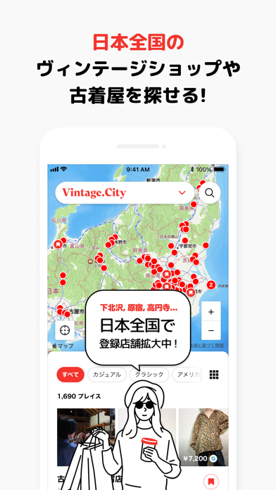 カジュアル、クラシックなど、服のカテゴリーごとに全国の古着屋をチェックできます。古着屋巡りがスマホでできるのが魅力。アクセサリーなどの小物を置いている店もあります。