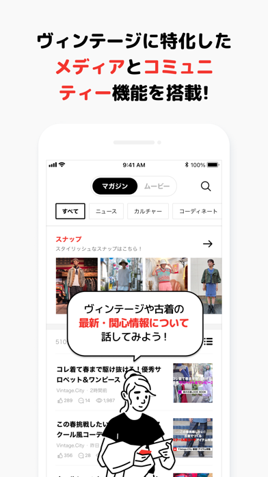 「コミュニティー」ではスナップショットやコラム、動画などが楽しめます。着こなしの参考にしたり、古着屋巡りの目星をつけたりできるので、チェックしておくのがおすすめです。
