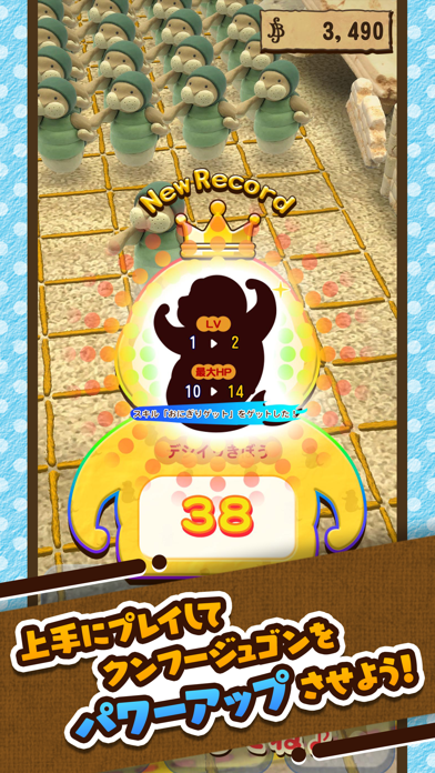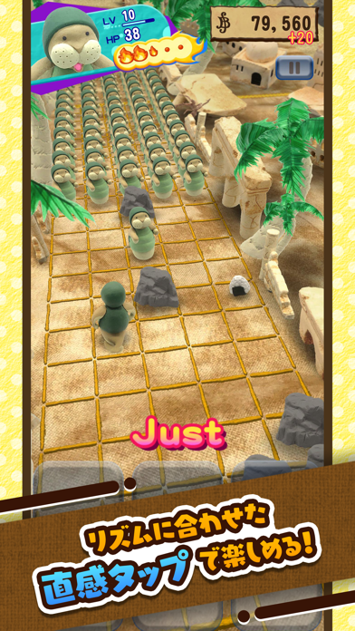 リズムよくタップをして、クンフージュゴンを行進させます。「フンッハッ」のかけ声に合わせて、画面下の矢印ボタンをタップ。タイミング判定が「Just」か「Good」なら先に進めます。道中の障害物を壊したり、避けたりして、最奥までたどり着きましょう。