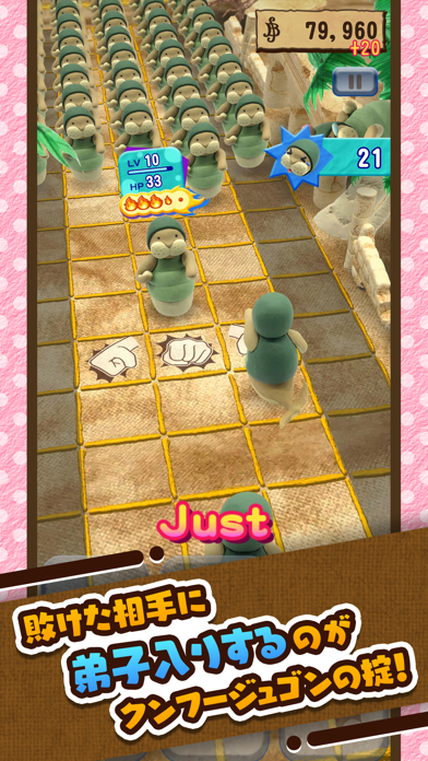 行進の途中で、敵のクンフージュゴンと戦闘が発生。操作するクンフージュゴンに目がけて、敵が次々と高速で突進してきます。敵が目の前に来たタイミングで、対応するボタンをタップして殴り飛ばしましょう。倒した敵は弟子となり、後ろから大群となりついてきます。