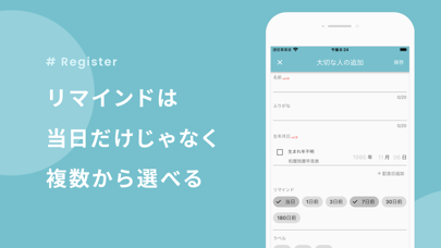 大切な人の誕生日や記念日を登録すれば、その日に近づくと通知が届きます。通知のタイミングもカスタマイズでき、日付も時間も自由に設定可能。大切な日を忘れることなく、当日のお祝いや準備ができます。