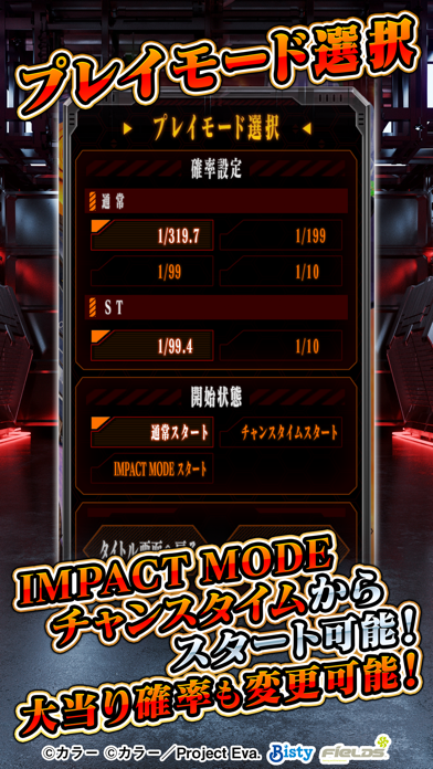 遊技前に各種設定を変更できます。大当りとSTの確率も変更できるため、大当りが乱発する夢のような環境にすることも。チャンスタイム、もしくはIMPACT MODEから遊技開始も可能となっています。