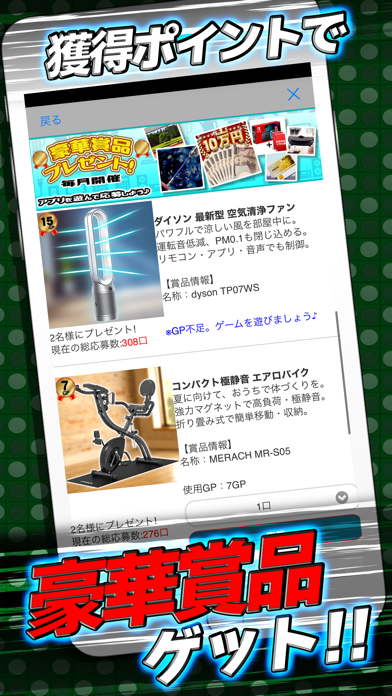 GPを消費して、豪華な賞品が当たる懸賞に参加できます。現金10万円のほか、最新の家電や海鮮などが入った福袋、ギフト券などさまざま。根気よく応募すれば当たるかもしれませんね。