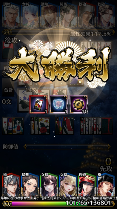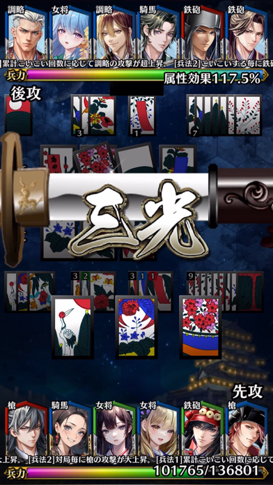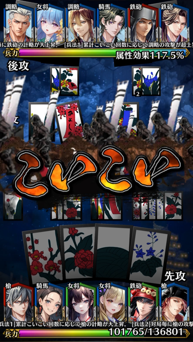 役をそろえるとその時点での攻撃力が決定。「こいこい」を選ぶとさらに役をそろえて攻撃力を増加でき、「あがり」を選ぶとそのまま攻撃します。相手の兵力をゼロにすると勝ち。武将の特性やそろえた役による戦略を練ることができます。
