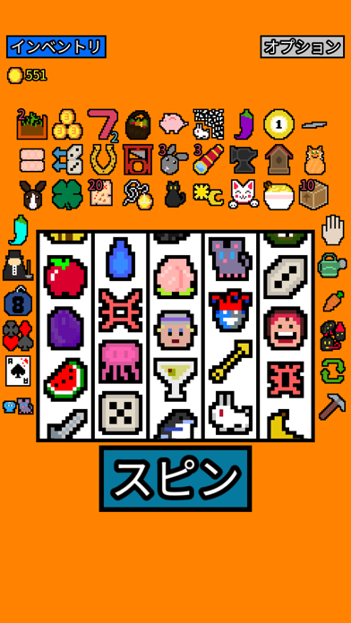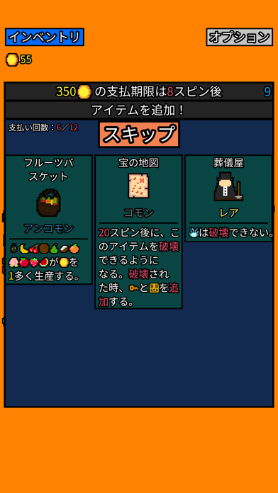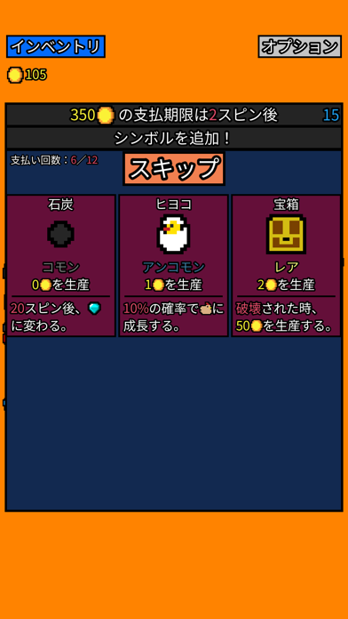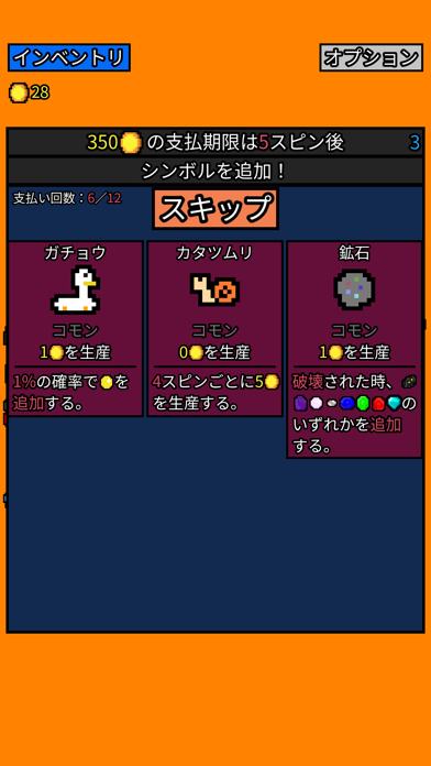 スロットでコインを稼ぎ、大家に家賃を払っていくシンプルなゲーム。スロットの出目(シンボル)にはさまざまな効果があり、1スピンするたびに出目の種類を増やせます。