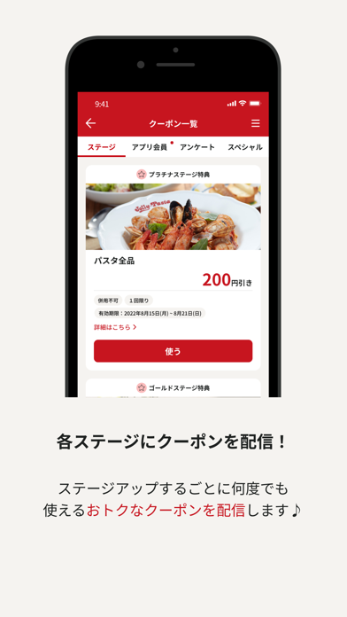 ジョリーパスタのレシートをカメラでスキャンすると、JOLLYをためられます。ためる数字に応じてステージが上がり、クーポンを取得。最終ステージではピッツァ・マルゲリータが半額になったりと、お得な特典がありますよ。