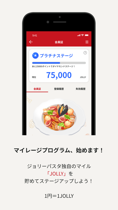 メニュー表やクーポンなどをチェックできるジョリーパスタの公式アプリ。ジョリーパスタのレシートをこのアプリに読み込むことで、ポイント(以下:JOLLY)をためられます。JOLLYをためてステージをアップさせると、さらにお得なクーポンをゲットできて便利ですよ。