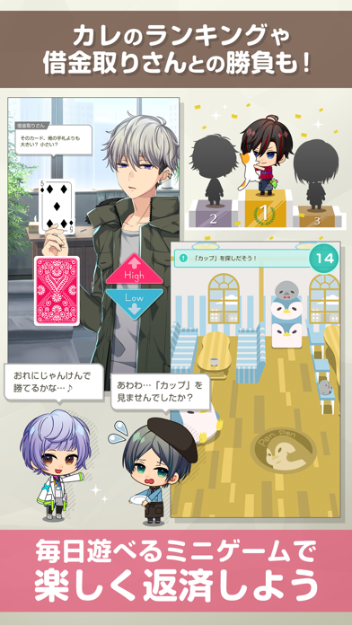 恋愛もいいけど、借金返済を忘れずに。放置でも自動的にお金が貯まっていきますが、スワイプでお金を回収するとより効率的。またランダムにミニゲームが発生することも。カレとのイベントを楽しみながら、少しずつお金を貯めていきましょう。