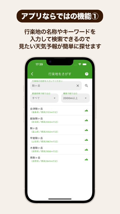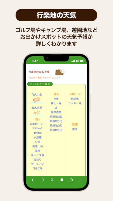 - レジャースポット別で天気予報がわかる。アウトドア計画のお供に