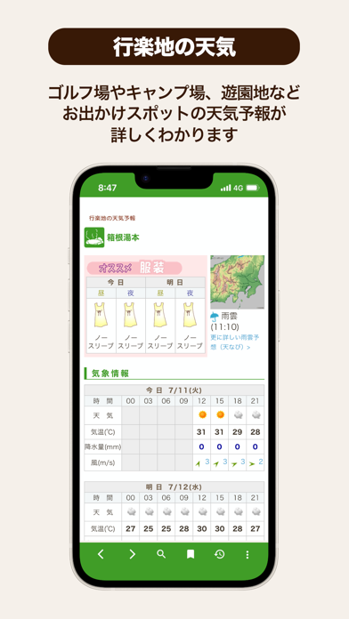 山やゴルフ場、遊園地などの行楽地の天気予報がわかります。その日の天候や気温、降水確率、おすすめの服装など、アウトドア活動に必要な情報が表示。お出かけスポットから検索できるため、天気予報も調べやすいです。