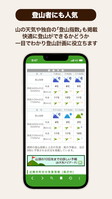 天気予報だけでは予測しづらい登山の安全性も確認できます。山の気象条件や登山の快適さをもとに登山指数を表示。登山指数がAの場合は登山に適した気候で、BやCの場合は登山を見送った方がいいでしょう。安全に登山できるかを判断する情報源になります。