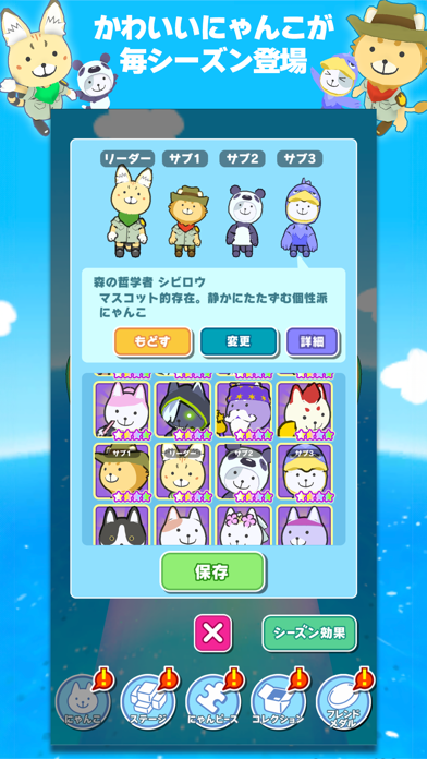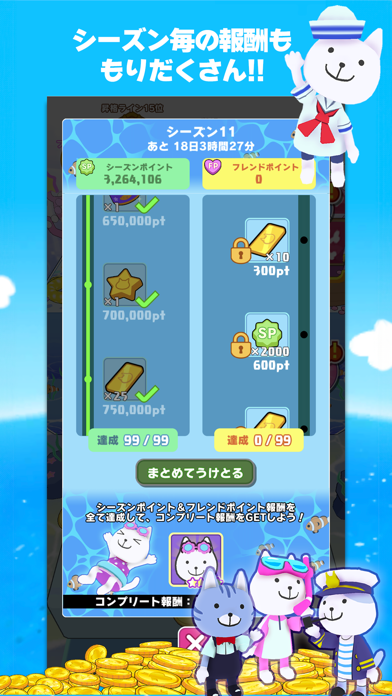 定期的に切り替わるシーズンイベントも楽しめます。各シーズンでは、限定のにゃんこやデコレーションアイテムが登場。見た目が変わるだけでなく、シーズンポイントの倍率アップなどの強化も得られます。ポイントを溜めて、たくさん報酬を獲得しましょう。