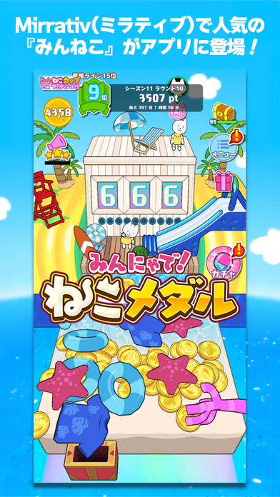 配信アプリ「Mirrativ」で遊べるメダル落としゲームです。定期的に開催されるシーズンイベントが魅力。各シーズン限定のにゃんこやステージ装飾アイテムは、かわいらしいものばかりです。