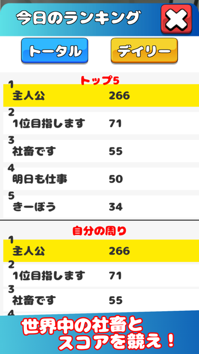 世界中の社畜とスコアを競うランキングもあります。ランキングは、歴代とデイリーの2種類。歴代で上位に入るのは難しくても、デイリーならトップ5にランクインするのも夢ではありません。