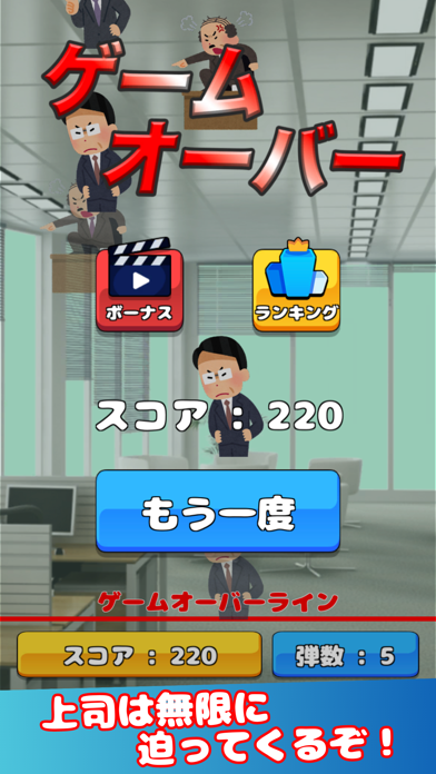 無限に迫り来る上司たちに爆弾をぶつけて倒します。各列のボタンをタップして爆弾を発射。役職が高いほど体力が多く、倒すのに必要な爆弾の数も増えます。撃ちすぎると弾切れになるため、各役職の体力を把握し、最低限の爆弾数で効率よく倒しましょう。