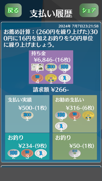 小銭の支払いを極めるための脳トレゲームです。できるだけ多くの硬貨を払いつつお釣りを少なくもらう「最適解」を考えながら問題を解いていきましょう。