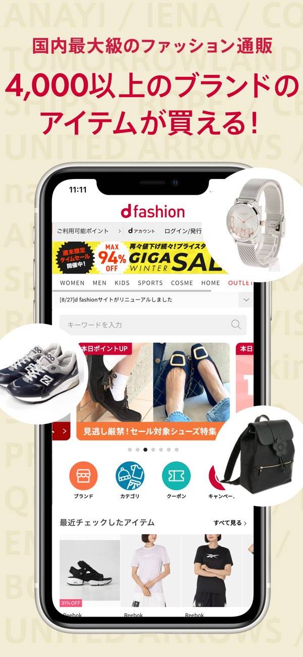 アディダスやサマンサタバサなど、大手ブランドの商品が多くそろっています。購入金額に応じてどれだけdポイントがもらえるのか商品ごとに表示しているところも魅力。dポイントをもっとお得にためたい・使いたい人におすすめです。