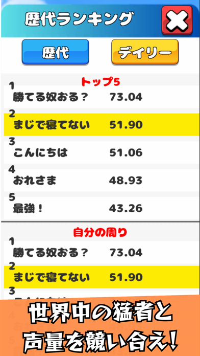 スマホのマイクに向かって大声で叫ぶ、カジュアルゲーム。声の大きさや伸びによってキャラクターが吹っ飛び、何m飛んだかスコアが表示されます。高く飛んだ後に、ベシャッと地面に叩きつけられる様はなんともシュール。