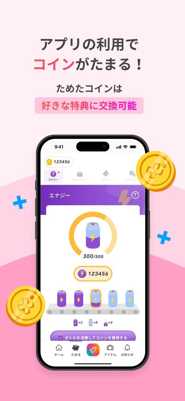 貯まったエナジーはコインに交換ができ、少しずつお小遣いが稼げます。