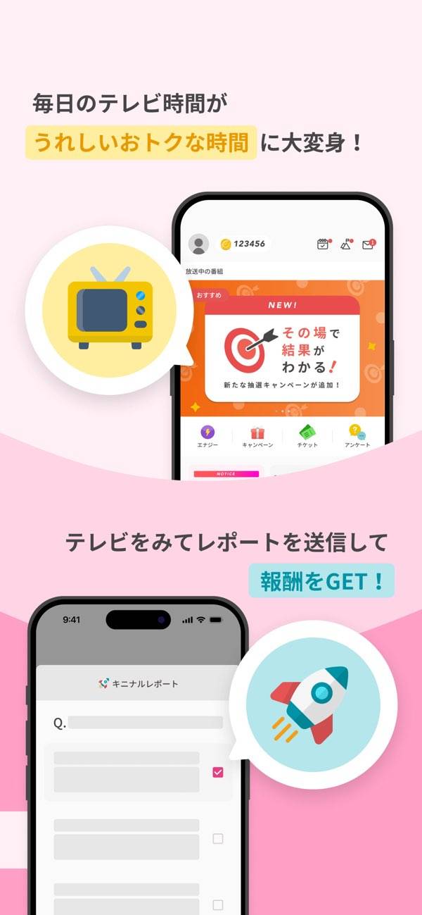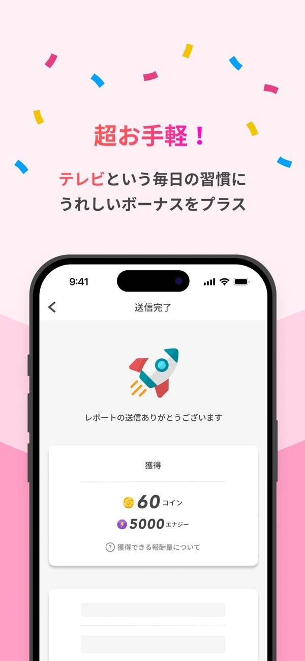 テレビを視聴しながら、表示されるアンケートに答えることでエナジーが貯まります。アプリがCMの音声を読み取り、アンケートを生成。選択式の簡単な設問が中心なので、番組の合間にサッと答えられるのが特長です。