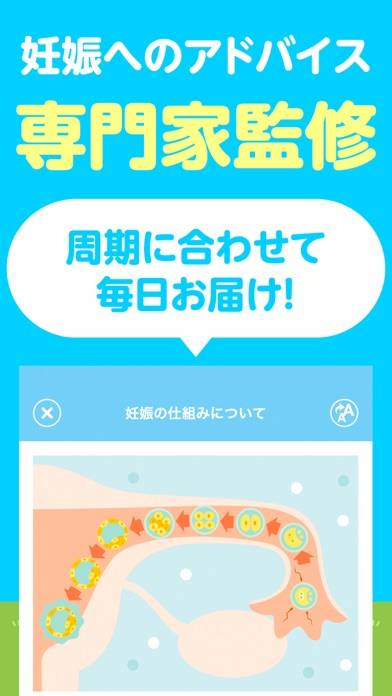 生理記録用のカレンダーから、タップだけで生理日を簡単に記録。さらに、妊娠の可能性の高さや生理予測日が、カレンダーのアイコンからひと目でわかります。排卵予測日などを詳しく確認したい場合は該当日をタップ。自分の体内で何が起きているかも解説されています。