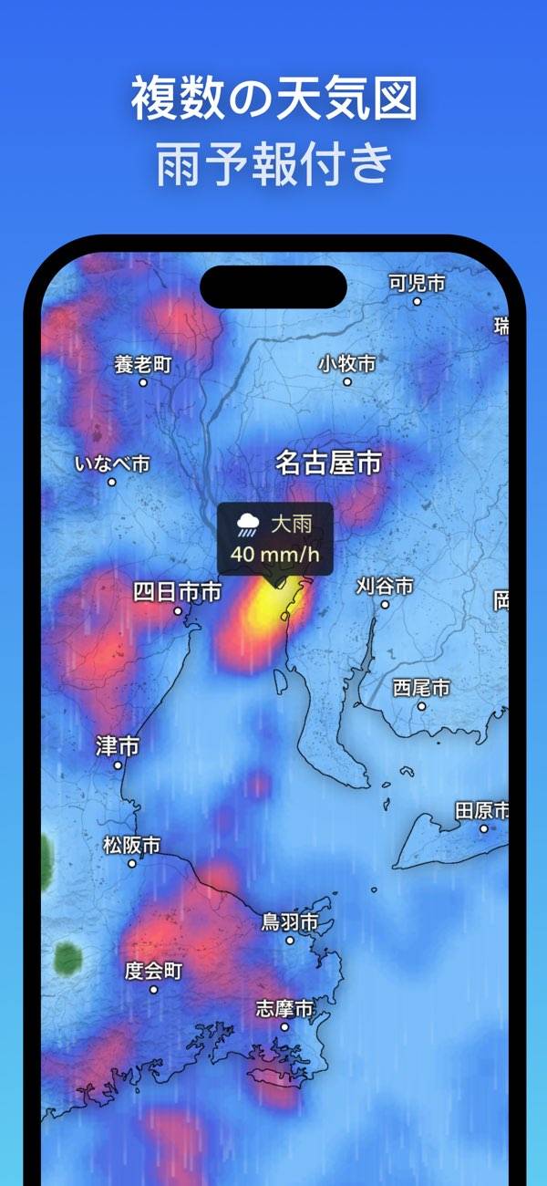 - 天気図の切り替えができる。衛星、降水量など7種類