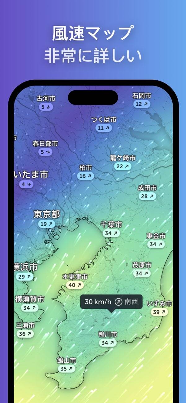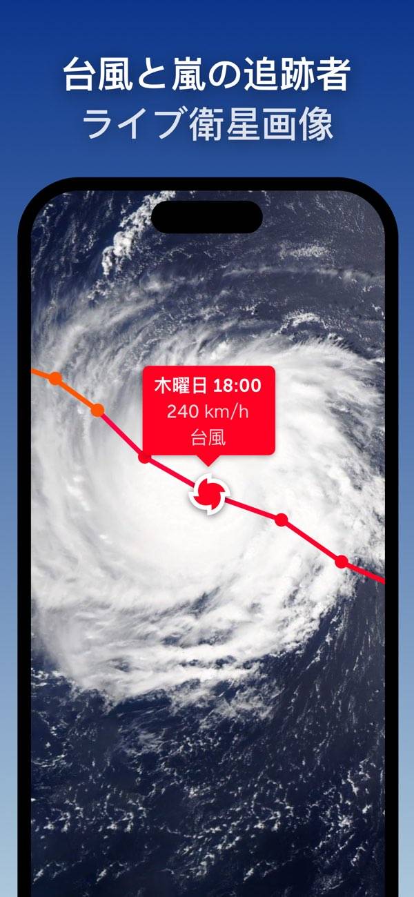 再生ボタンをタップすると、経過時間によって台風がどこに到達するか表示。アイコンで台風の規模感もわかり、災害などにも備えやすいです。夏から秋にかけて、台風が多い時期に役立ちそうですね。