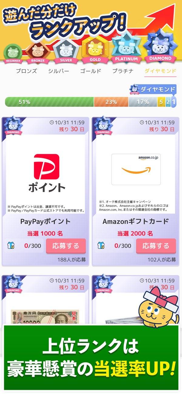 間違い探しを1問クリアするだけで懸賞に応募可能。1ポイントから応募でき、1つの賞品にたくさんのポイントを追加できます。対象賞品は、グッズやギフトカード、現金までもらってうれしいものばかり。応募した懸賞や抽選結果は、一覧から簡単に確認できます。
