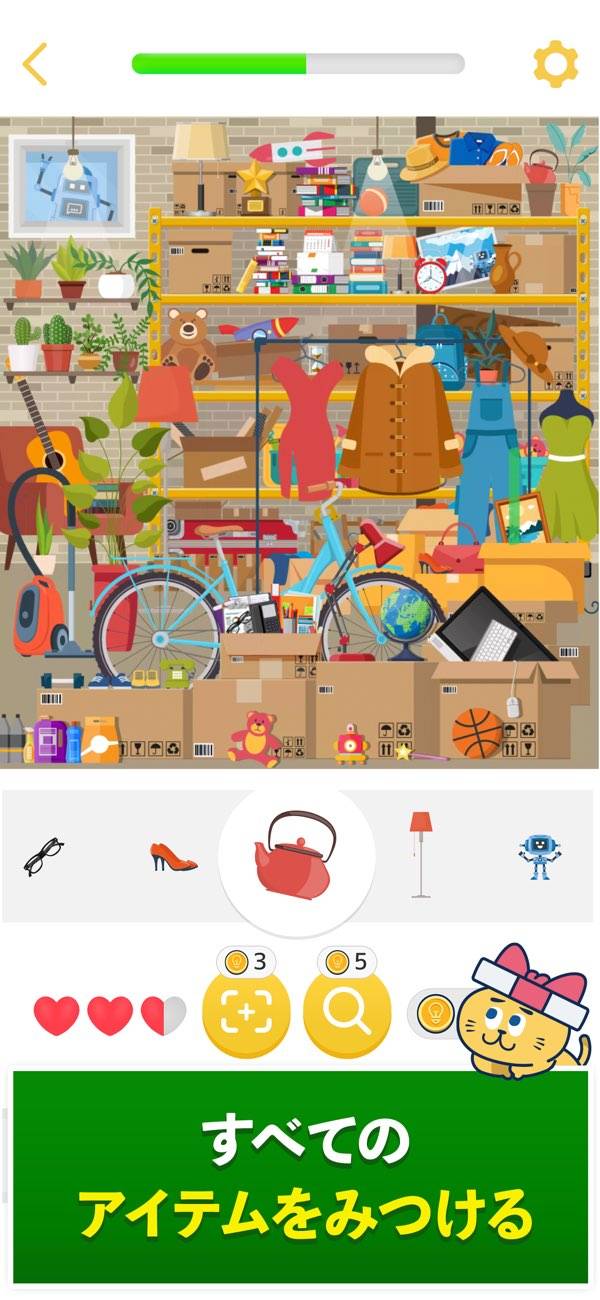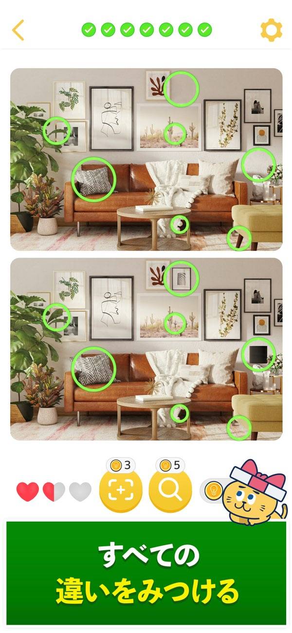 大きさや位置のわずかな差など、間違い探しの難易度は少々高め。間違い箇所も多く、目を凝らさないと見つけるのも大変です。画像の拡大・縮小を駆使して探しましょう。また、ヒントコインを使えば、未発見の間違いを範囲やポイントで教えてくれます。