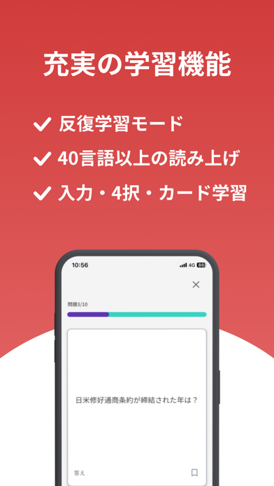覚えた内容を忘れにくくするために、間隔をあけて復習できる暗記モードを搭載。成果はグラフとなって表示してくれるので、毎日のがんばりが実感しやすいです。苦手な部分は赤色やオレンジ色になっておりひと目で確認できるので、克服すべき分野がわかりやすいところも魅力。