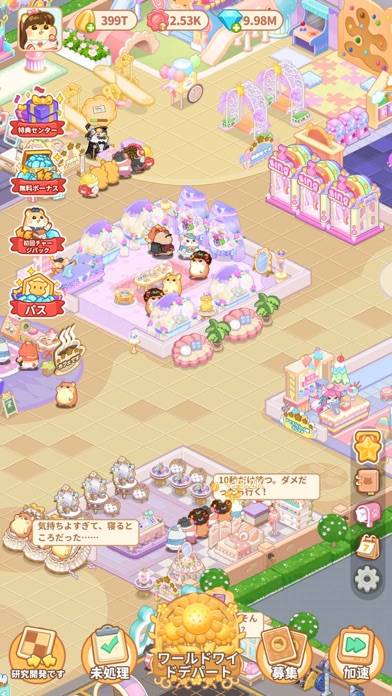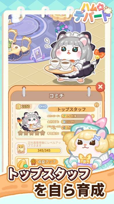 店員ハムスター「ハム材」を研修して、収益の効率をアップ。ハム材のレベルを上げると、会計スピードや収益も上がります。また、ハム材によってスタッフスキルもバラバラ。決まった店で働いたときに収益が上がるなど、得意な店があるハム材もいます。