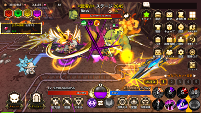 モンスターが落とす素材を使い、各能力のレベルを上げてキャラを育成。モンスターとの戦闘はもちろん、次のステージへの移動も自動です。また、アプリを閉じている間も、戦闘とステージ攻略は続行。次にアプリを開いたときに、育成素材などの報酬がもらえます。