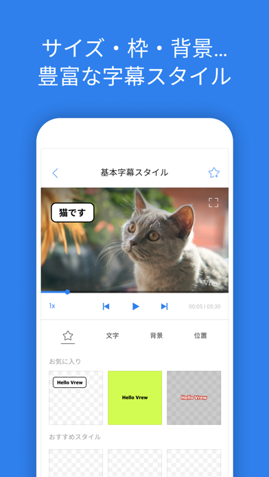 動画編集に欠かせないフォントなどの素材も本アプリに集約。サイトで素材を探して事前にダウンロードしておく必要もありません。用意されたフォントは、人気YouTuberも多く使っている無料フォントばかり。著作権や商用利用周りの心配もありません。