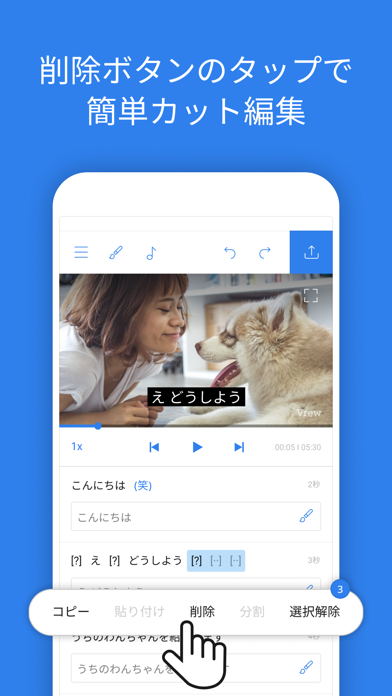 クリップ分割や字幕挿入が正確な箇所でできるよう細かな調整にも対応。例えば、文字起こし部分の「‥」は無音を表していて、「‥」を削除すると無音シーンも削除できます。そのため、細かい無音のカットもサクサクです。