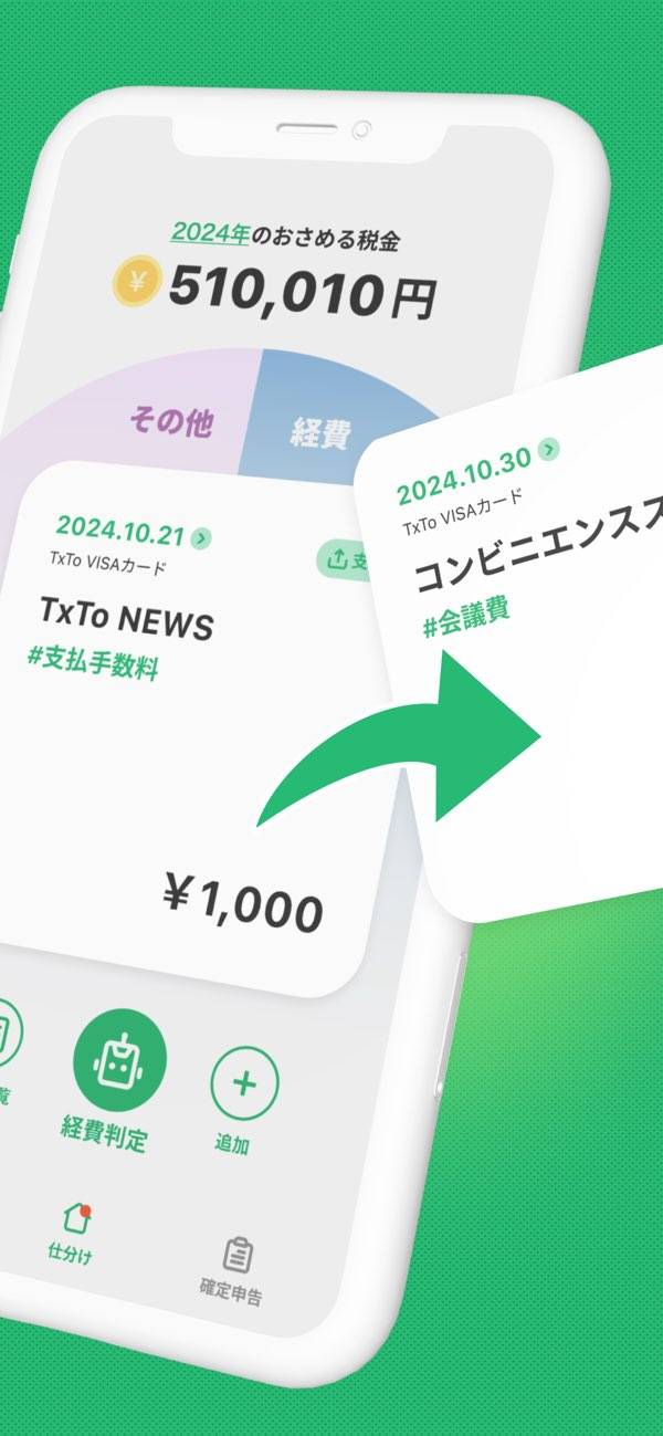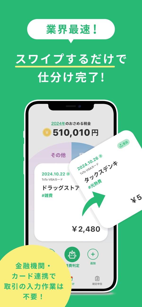 仕分け作業の効率化から、確定申告書の提出までできるアプリです。連携した銀行口座やクレジットカードから取引内容を読み込み、確定申告が必要かをスワイプで仕分け。自動仕分けにも対応しており、操作の手間すら省けます。さらに税務調査のリスクチェック機能や、24時間対応のAIチャットサポートも搭載しています。