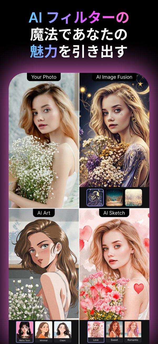 - 写真を読み込むと、AIが美しいイラストに変換してくれるアプリ